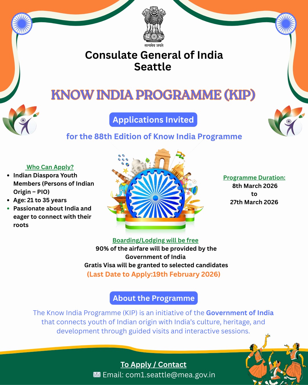 Ministry of External Affairs, Govt. of India invites applications from Indian Diaspora Youth Members, for the 88th Edition of the "Know India Programme" (KIP) scheduled from 8 March to 27 March 2026.